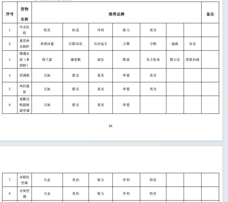 疑问:我方认为第一项冷水机组第七项多联机第八项分体机一线国产品牌格力美的均在推荐品牌内,但是第四项空调箱第五项风机盘管国内一线品牌只有美的在内,格力作为一线空调品牌却不在推荐品牌范围内,有失公平公正,违反招投标法。建议增加格力品牌。