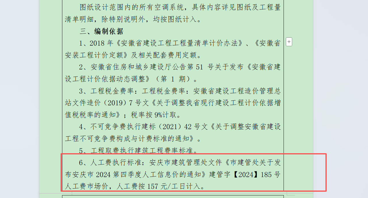 1、最高投标限价说明中要求:“6、人工费执行标准:安庆市建筑管理处文件《市建管处关于发布安庆市2024第四季度人工信息价的通知》建管字【2024】185号人工费市场价,人工费按157元/工日计入。”
